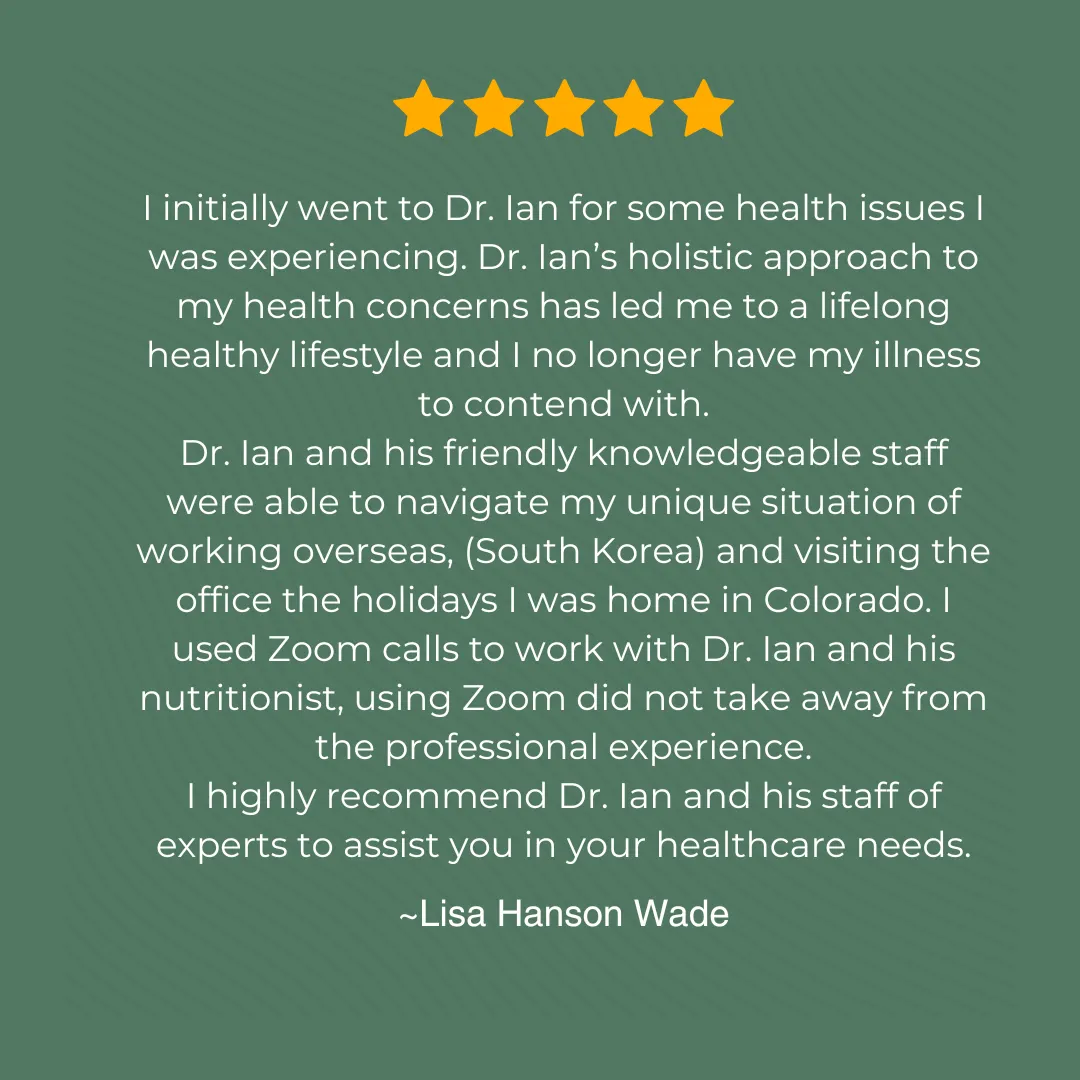 Dr. Ian specializes in chronic and complex conditions using the functional medicine model. He is one of the very few physicians in the country to combine a Masters in Functional Medicine and certification from the Institute of Functional Medicine with functional neurology training to round out comprehensive treatment programs. With over 15 years in practice and having served over 4,500 clients to date, he is determined to find root causes and teach his clients how to maintain optimal health. Dr. Ian continues to reside in Colorado with his family and maintains a 100% remote telemedicine practice